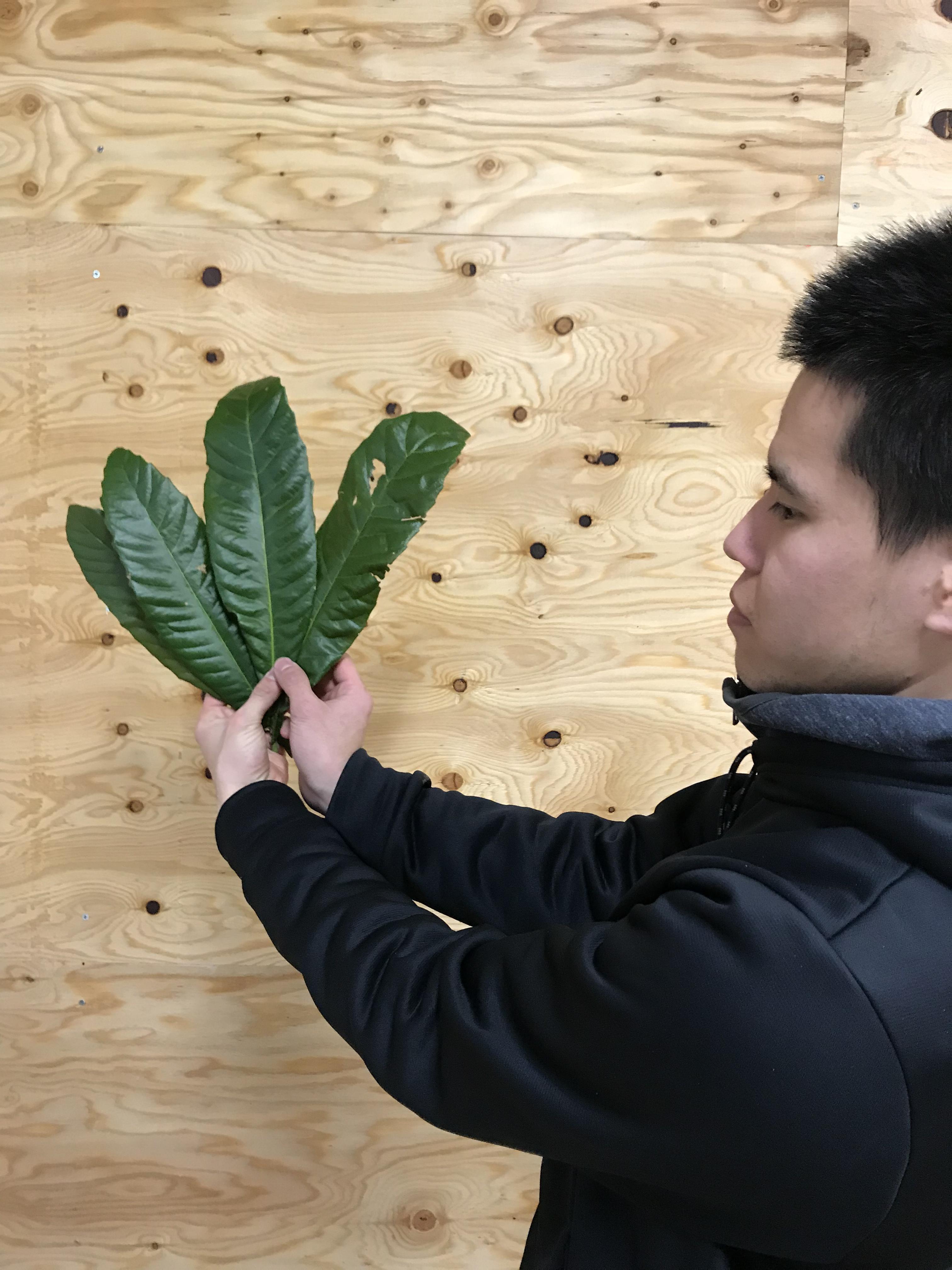 お仕事としては、まずこのビワの葉を持ち帰って来て、施設で洗浄し乾燥させ、ビワ茶用の乾燥葉を作ります。その後、もし可能であれば、細かく粉砕し炒ってビワ茶を作り、パック詰めをし製品として完成させます。どこまでの作業ができるかは施設次第ですが、まずはどのくらいのスピードでできるのかを早速今日から試してもらっています。