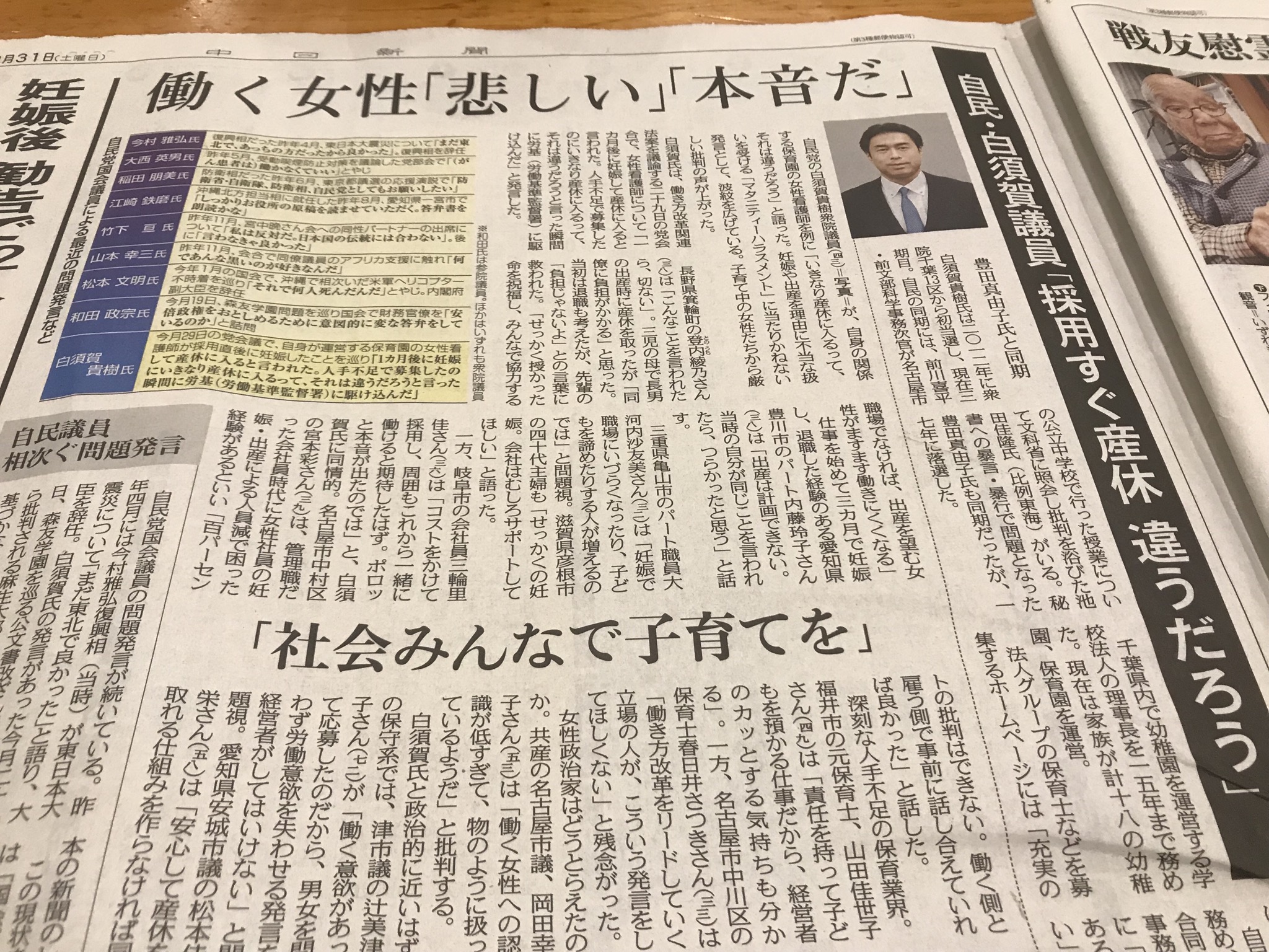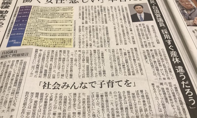 数週間前の中日新聞の記事。女性看護師を採用したらすぐに妊娠が発覚し白須賀議員がこの様に発言したというニュースです。
